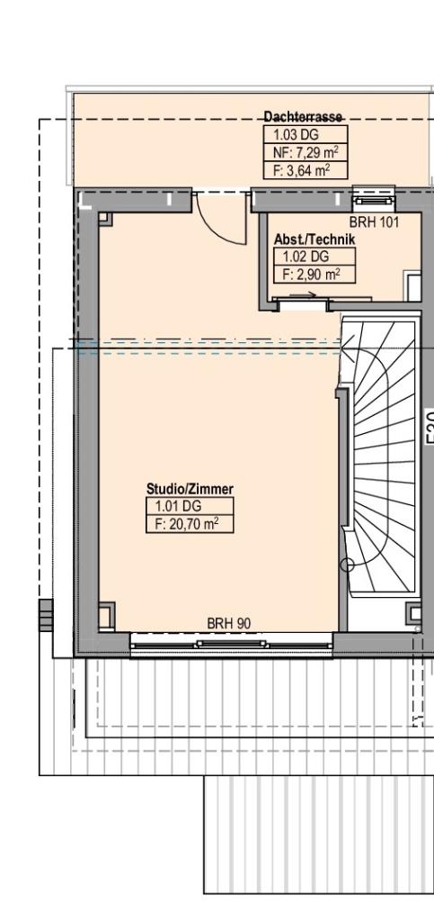 Die wohl größten Möglichkeiten der Gestaltung bestehen jedoch im großen Studioraum im Staffelgeschoss. Außer einem kleinen, pla-nerisch gut eingebundenem Abstellraum, der zugleich auch Technikraum ist, liegt die gesamte Wohnraumfläche offen und kann damit ganz individuell als Relaxraum, Fitnessraum, Spielzimmer o.ä. hergerichtet werden. Abends lädt hier die Dachterrasse ganz bestimmt auch Sie zum Blick in die Sterne ein.