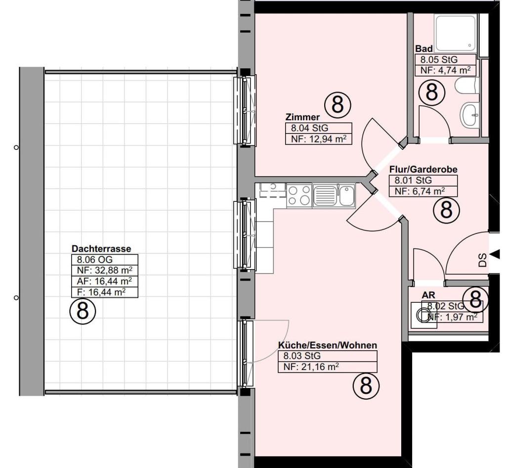 Die Wohnung befindet sich nach der Fertigstellung in einem bezugsfertigen Zustand mit weiß gestrichen Wänden und Bodenbelägen in allen Räumen. Sie ist dann ausgestattet mit einem kompletten Duschbad und einer vollwertigen Einbauküche. Viele Extras wie z.B. elektrische Außenrollläden vor den Fenstern, eine kontrollierte Be- und Entlüftungsanlage mit Wärmerückgewinnung, die Dusche mit Glasabtrennung, der elektrische Handtuchheizkörper und die Fußbodenheizung machen diese Wohnung mit Ihrer eigenen Gestaltung sicher zu etwas ganz Besonderem.